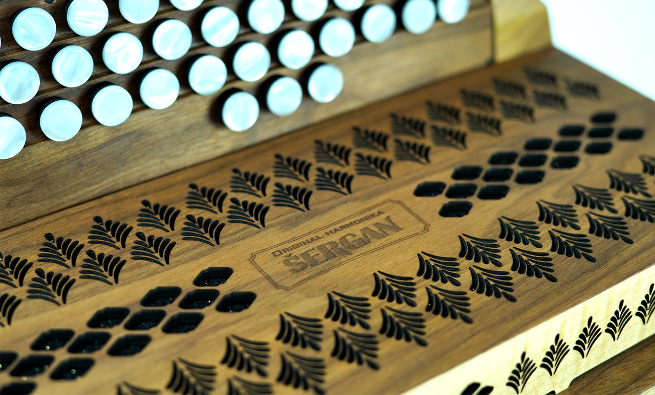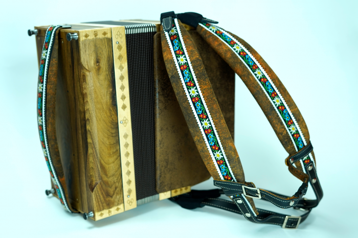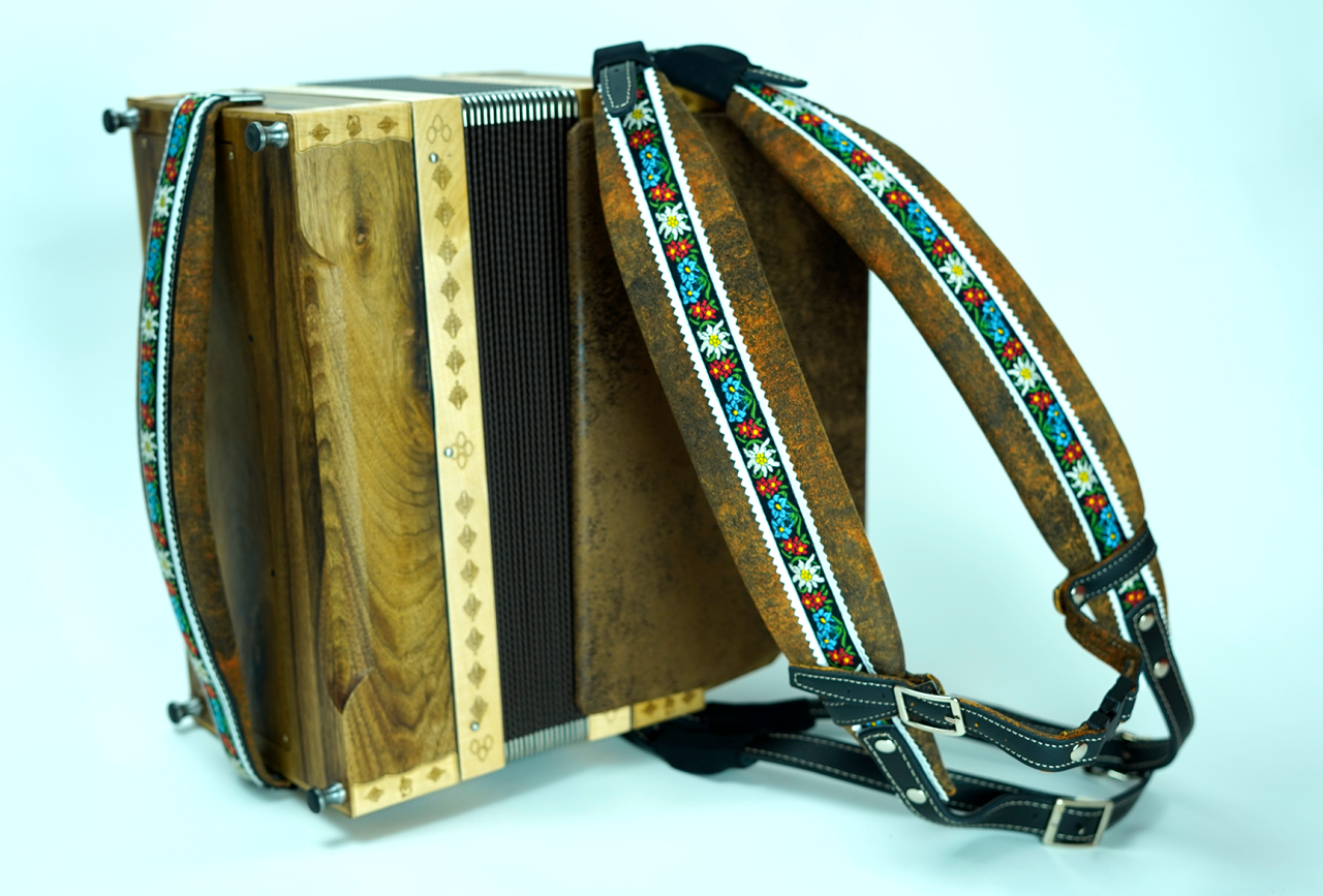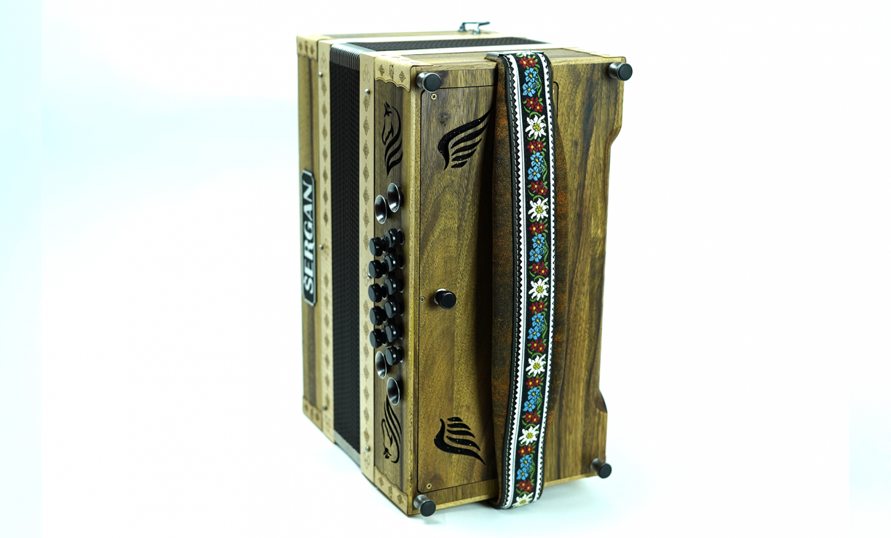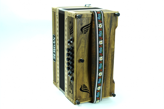 Prodam diatonično harmoniko odrasle velikosti 38 cm. Narejena je iz masivnega orehovega lesa in zaščitena z naravnim oljem.