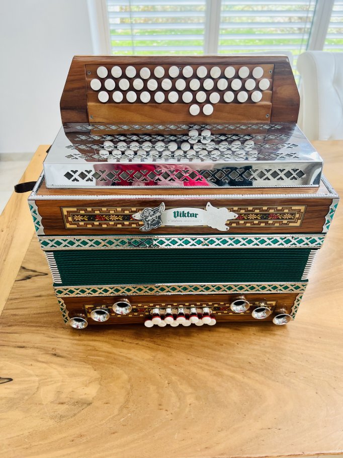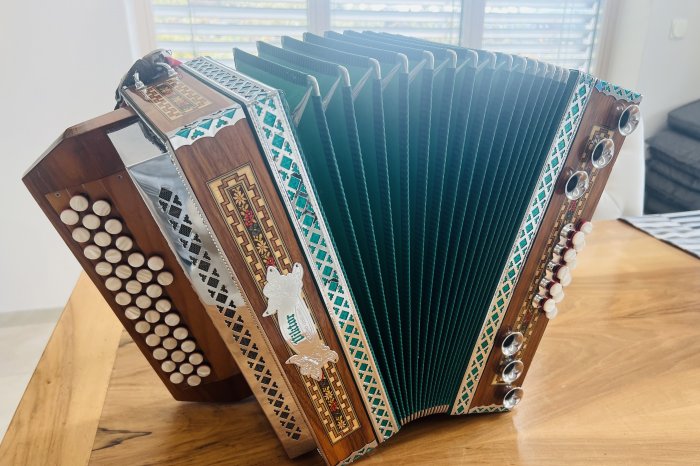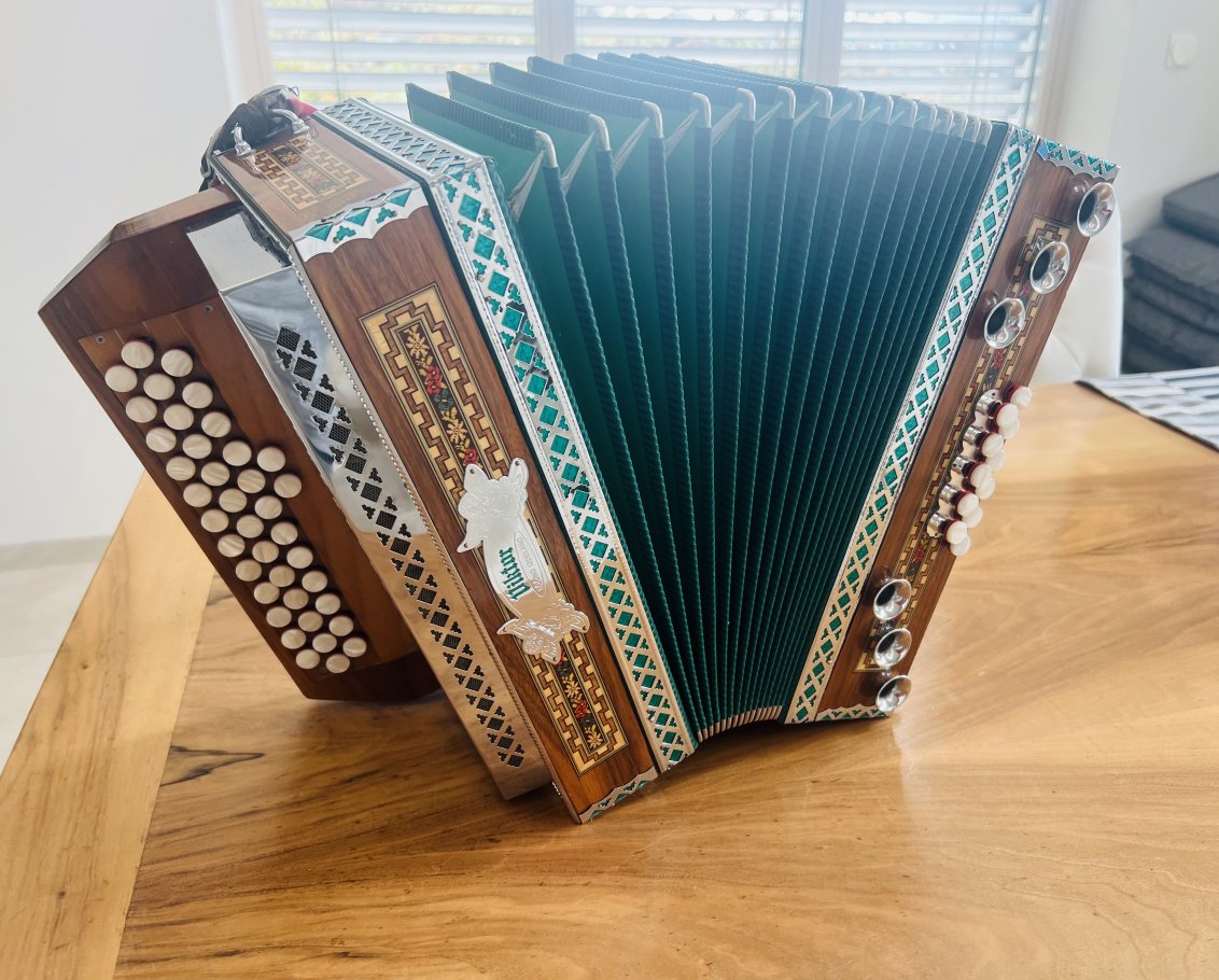 Prodam Kotnik harmoniko B Es As z dvem poltonoma, odlično ohranjeno z zelo lepim zvenom. Zraven je tudi kovček.